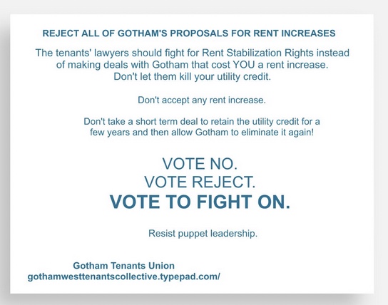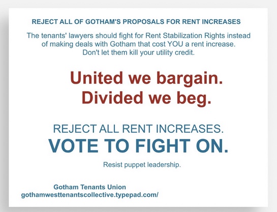 Even though HCC is no longer involved in the case, the remaining tenant attorneys continue to negotiate aggressively against their clients as though they have a vested interest in winning a rent increase for Gotham. They no longer talk about the tenants' rights under Rent Stabilization. They no longer talk about the strength of our case even though they cooed about it at the time that it was filed. They no longer talk about litigating tenants' very strong claims. The only thing the tenants' lawyers want to talk about is how much the tenants will give Gotham in rent increases. Why in the world is our own counsel even talking about a rent increase for tenants when it would be a violation of Rent Stabilization Law? It would seem that the original incentive for forcing a rent increase may be alive and well and uppermost in the minds of tenants' counsel. $100,000 may just be too difficult to resist.